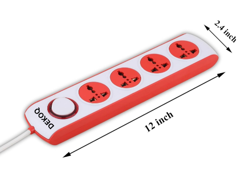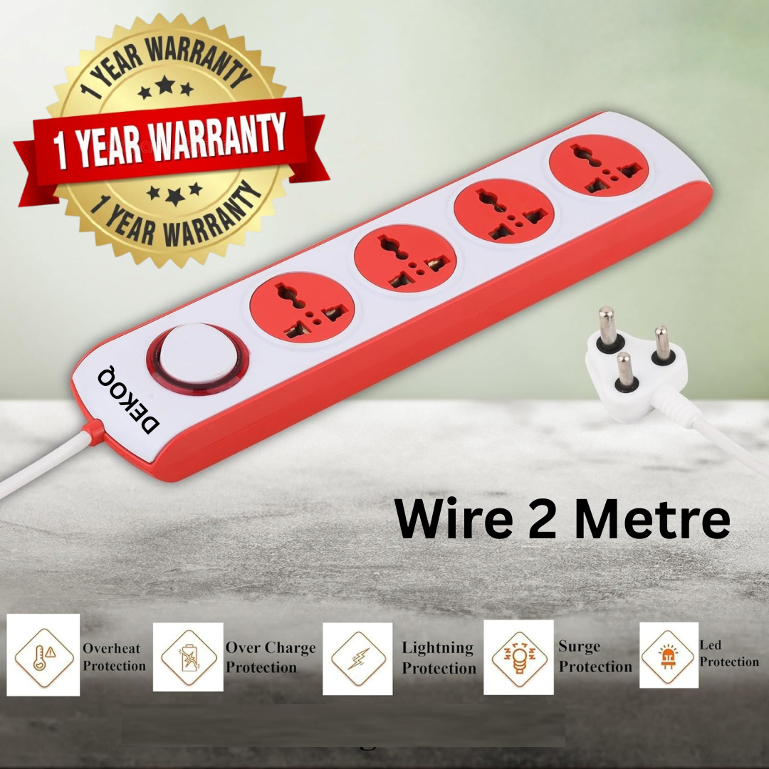 DEKOQ 4 Socket Extension Board has 2 Meter Heavy duty cord A special cable tie has been provided on the long power cord for convenience during operation and storage. Supply Indicator The Spike guard has an LED Supply indicator embedded in the ergonomic design that indicates power status if On/Off. Novel & Distinctive design Combination of advanced mould design, unique exquisite workmanship & our commitment to perfection have rendered the product its excellent quality. You can press red button to return to safe function mode. Adequate space has been provided between the sockets for accommodating plugs of different designs. Suitable for household, office, computer and its Peripherals, DVD, T.V etc