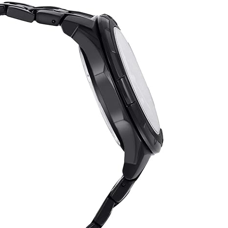 This watch has a black ion-plated band and case which gives it rigidity and makes it resistant to scratches. It has a mineral glass to protect the dial from damage and a rotating crown to set the time easily. The buttons on the side control the stopwatch.